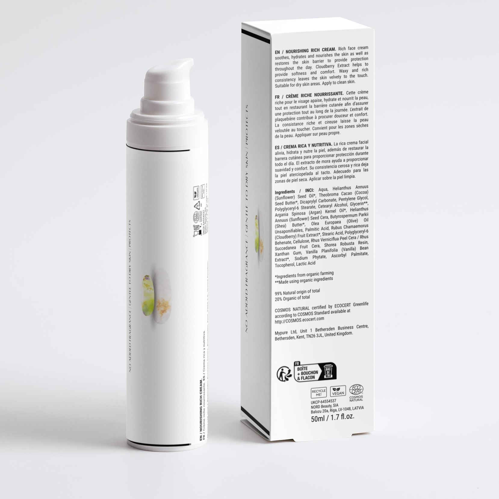 Indulge in comfort with Rich Face Cream, a nourishing essential designed to soothe and protect dry or mature skin. This fragrance-free, COSMOS NATURAL certified formula is 100% natural, 21% organic, and vegan. Its rich, waxy texture with Shea Butter and Cloudberry Extract restores the skin barrier for lasting hydration. Housed in a 50 ml cylindrical recycled plastic pump bottle, it leaves skin smooth, resilient, and protected all day
